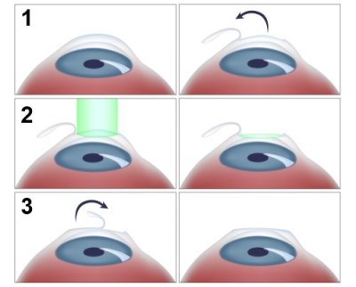 Beim Femto-LASIK wird die Hornhaut in einem ersten Schritt mittels einem Laser (Femtosekundenlaser) geschnitten. Dabei entsteht ein Deckel (auch “Flap“ genannt), der aufgeklappt wird (1). In einem zweiten Schritt wird nun das darunterliegende Hornhautstroma mit einem Excimer-Laser computergestützt abgetragen (2). Danach wird der Deckel wieder zurückgeklappt (3). Durch die daraus resultierende Veränderung der Hornhautkrümmung verändert sich auch die Brechkraft der Hornhaut, somit werden die Lichstrahlen scharf auf der Netzhautoberfläche abgebildet. Ziel ist es, dass der Patient ohne Brille scharf sehen kann.