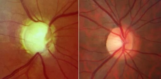 Abbildung 3: Gesunder Sehnerv (rechts) und geschädigter Sehnerv (links)